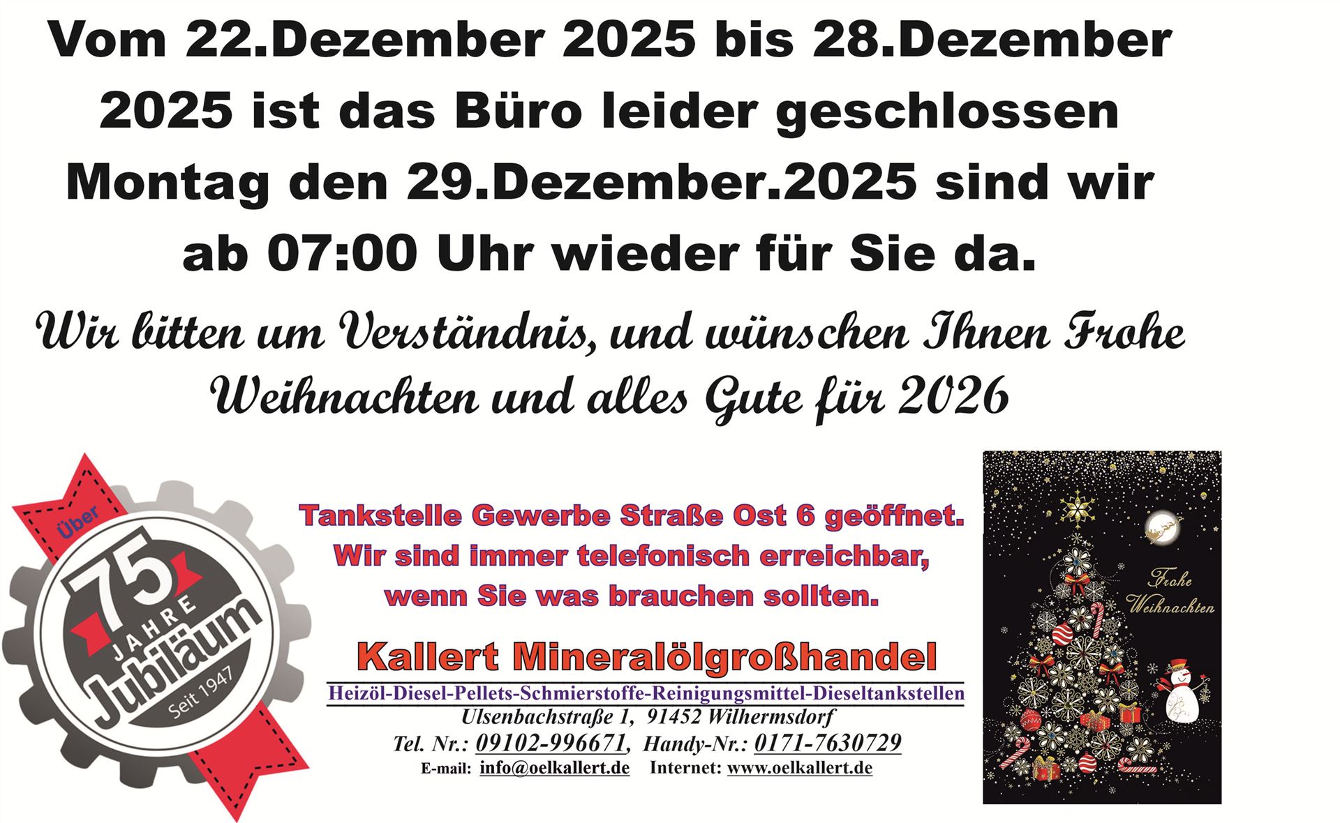 Wir möchten Ihnen mitteilen, dass wir ab sofort für Heizöl, Dieselkraftstoff, Pellets und AdBlue Lieferungen Anfragen und Bestellungen über Firma Kallert Mineralölgroßhandel unter den neuen Kontaktinformationen zu erreichen sind.: E-Mail: info@oelkallert.de - Tel. Nr.: 09102-996671 - Handy: 0171-7630729 - Internet: www.oelkallert.de