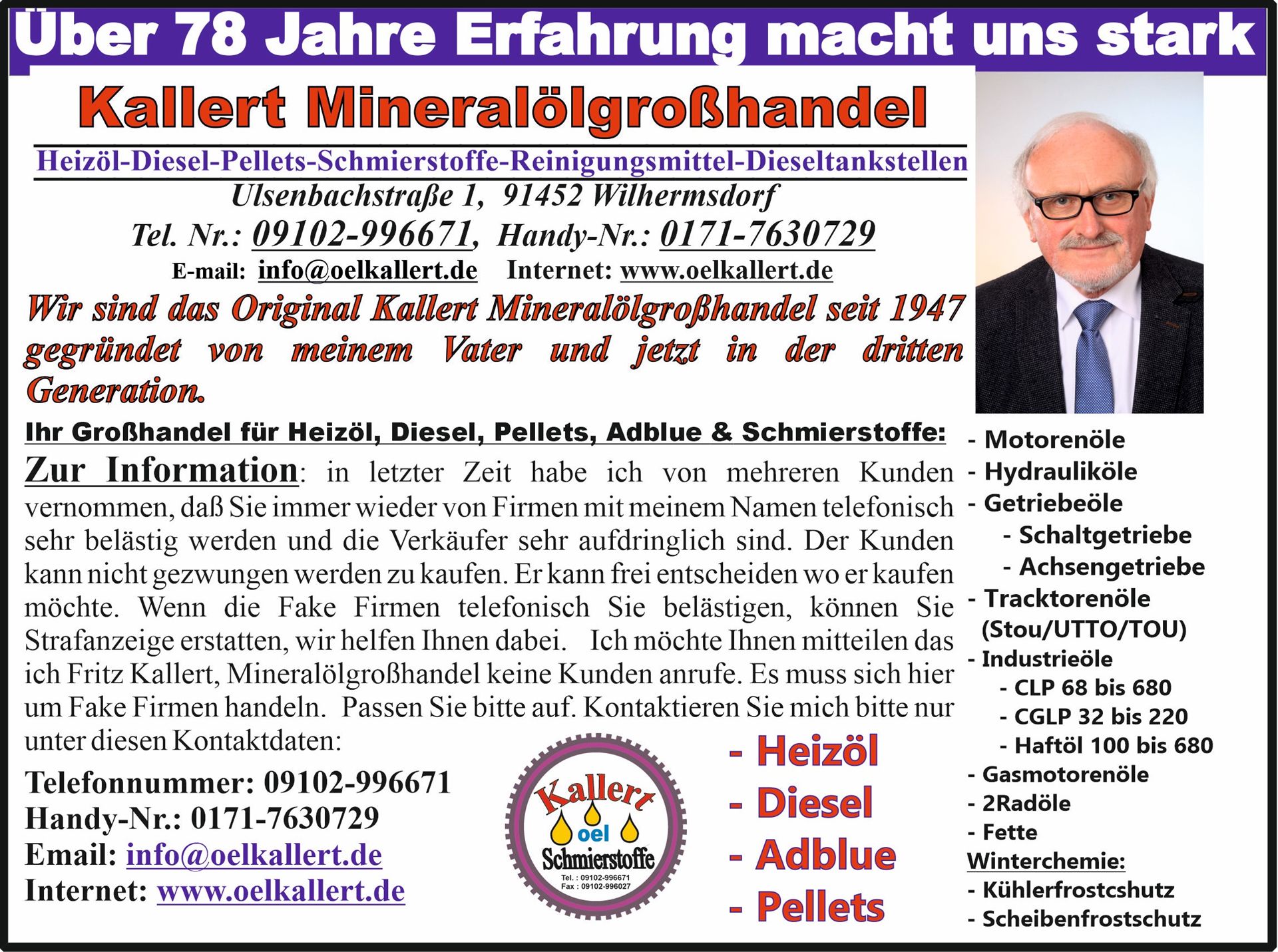 Wir möchten Ihnen mitteilen, dass wir ab sofort für Heizöl, Dieselkraftstoff, Pellets und AdBlue Lieferungen Anfragen und Bestellungen über Firma Kallert Mineralölgroßhandel unter den neuen Kontaktinformationen zu erreichen sind.: E-Mail: info@oelkallert.de - Tel. Nr.: 09102-996671 - Handy: 0171-7630729 - Internet: www.oelkallert.de